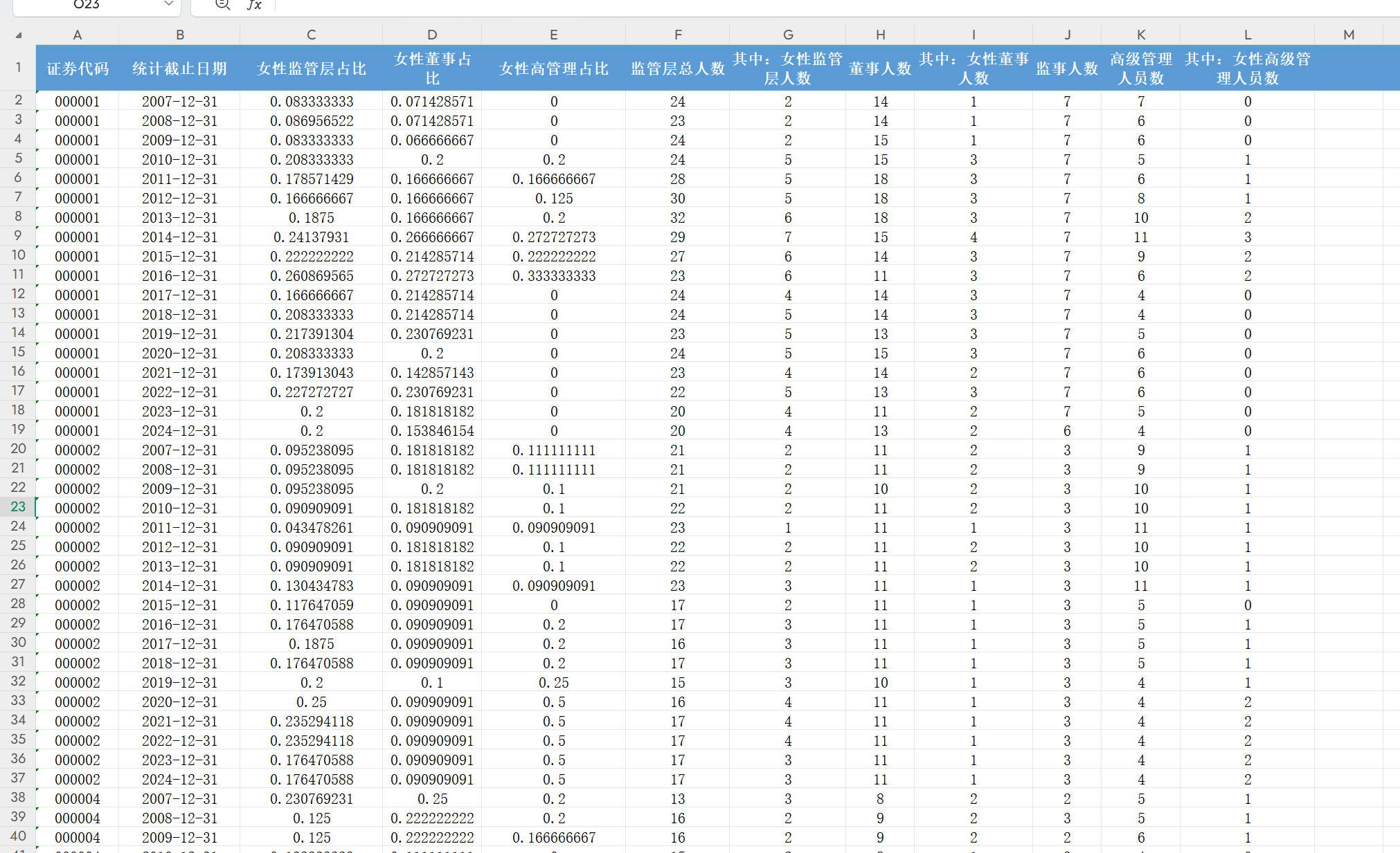 证券代码 统计截止日期 女性监管层占比 女性董事占比 女性高管理占比 监管层总人数 其中:女性监管层人数 董事人数 其中:女性董事人数 监事人数 高级管理人员数 其中:女性高级管理人员数