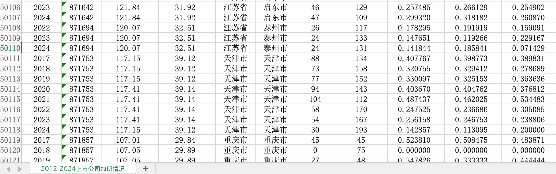 中国上市公司加班数据2012-2024全年加班比例工作日加班比例周末加班天数省份城市