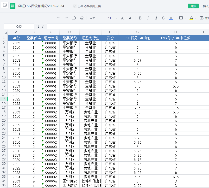 包含指标:年份、股票代码、证券代码、股票简称、证监会行业、省份、ESG得分-年均值、ESG得分-年中位数