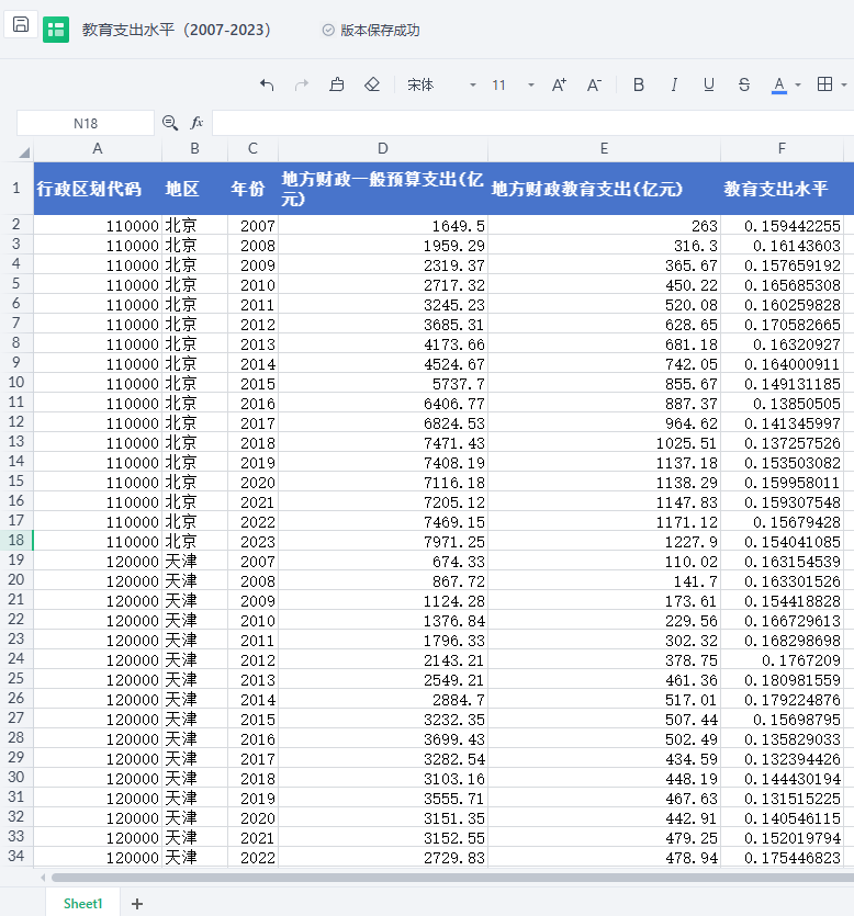 【面板数据】全国分省教育支出水平数据集(2007-2023年)