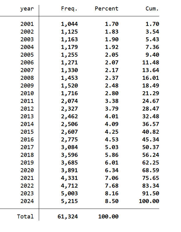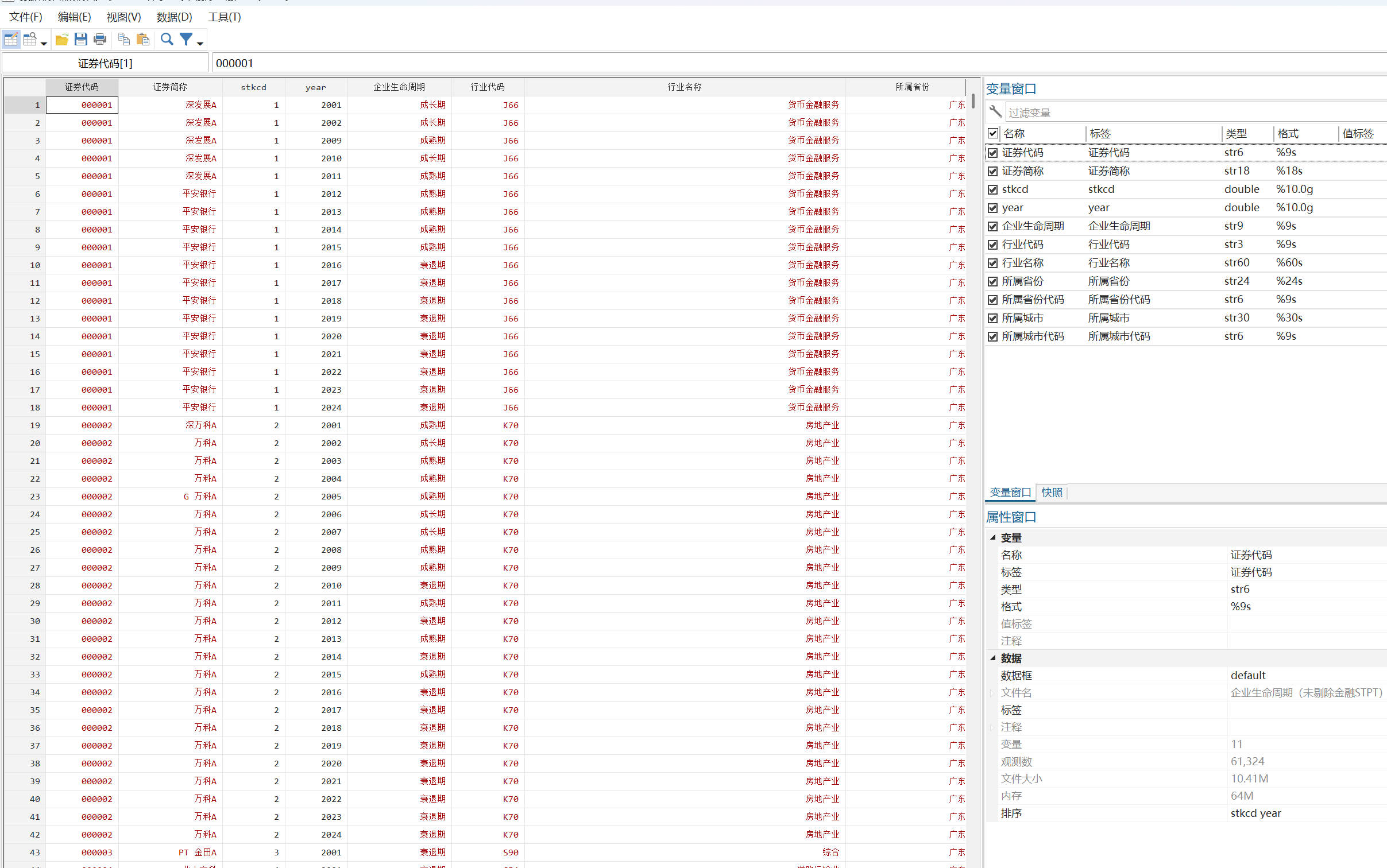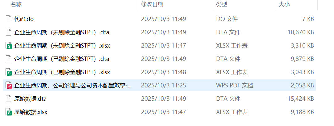 2、把总样本分行业进行由大到小排序,其中每一行业样本都按照总得分大小分成三部分,得分最高的 1/3 部分为成长期的企业,得分最低的1/3 部分为衰退期的企业,中间一部分为成熟期企业。 最后把各行业的分类结果汇总,即得到所有上市公司企业生命周期的样本分类结果。(对应结果中的“企业生命周期1”) 另外一种划分方法是得分最高的 1/4 部分为成长期的企业,得分最低的约1/4部分为衰退期的企业,中间一部分为成熟期企业。(对应结果中的“企业生命周期2”) 注:为尽量降低企业生命周期不同阶段的划分偏差,在进行企业生命周期不同阶段划分时,采用的样本为剔除指标不健全公司后的全部上市公司,而后分别按行业进行打分排序,同时等分为成长期、成熟期与衰退期三个阶段。 建议:一般是所有相关数据都找齐之后并剔除缺失值之后再开始划分企业生命周期。