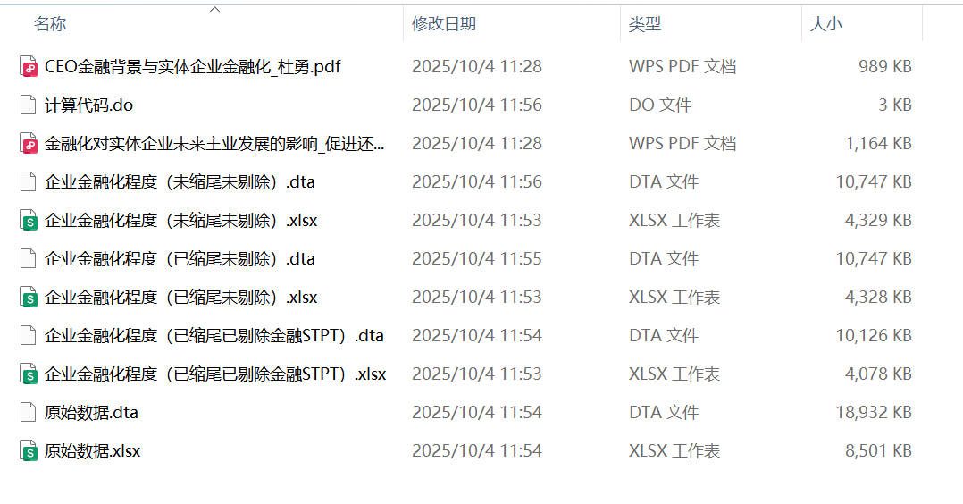 - 三个版本:企业金融化程度(未缩尾未剔除)、企业金融化程度(已缩尾未剔除)、企业金融化程度(已缩尾已剔除金融STPT)