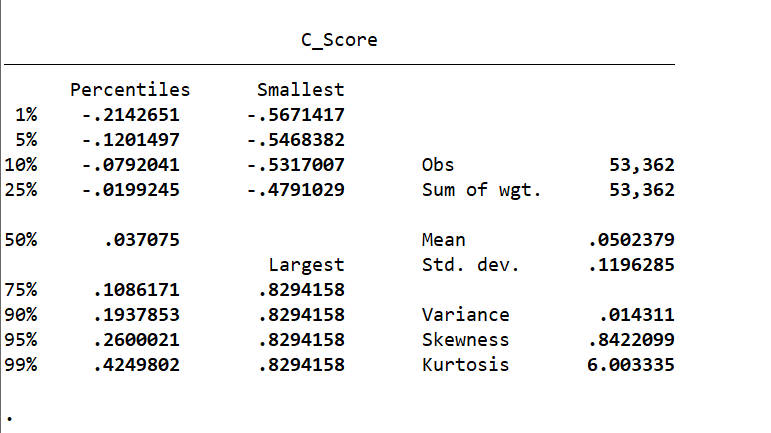 【C-score】使用Basu模型以及其拓展模型进行计算,具体模型参考刘斌和吴娅玲(2011)研究中的研究设计部分。C-score为所求衡量每一家公司每一年会计稳健性的指标,该指标为衡量会计稳健性的正向指标,即C-score值越大,企业会计稳健性越强。注意:由于C-score某种程度上是样本回归估计拟合的结果,而样本量的不同会导致结果不同,因此本资料的两个版本:剔除版与未剔除版,两个样本量不同的数据集所计算出的结果不同属于正常现象,但由于剔除量相较总体来说并不多,对回归结果的影响可能不大,因此根据自身情况选择使用任一版本即可