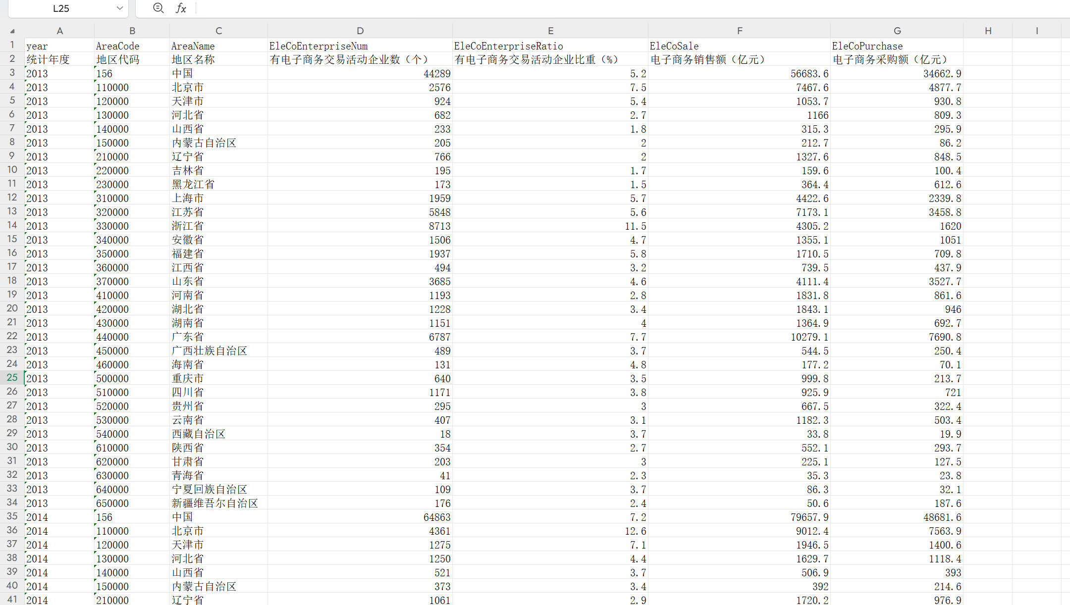 数据说明:各地区企业电子商务情况统计了31个省份、直辖市有电子商务交易活动企业数(个)、有电子商务交易活动企业比重(%)、电子商务销售额(亿元)、电子商务采购额(亿元)等变量。文件提供.xlsx和.dta两种格式,可使用stata或excel打开。