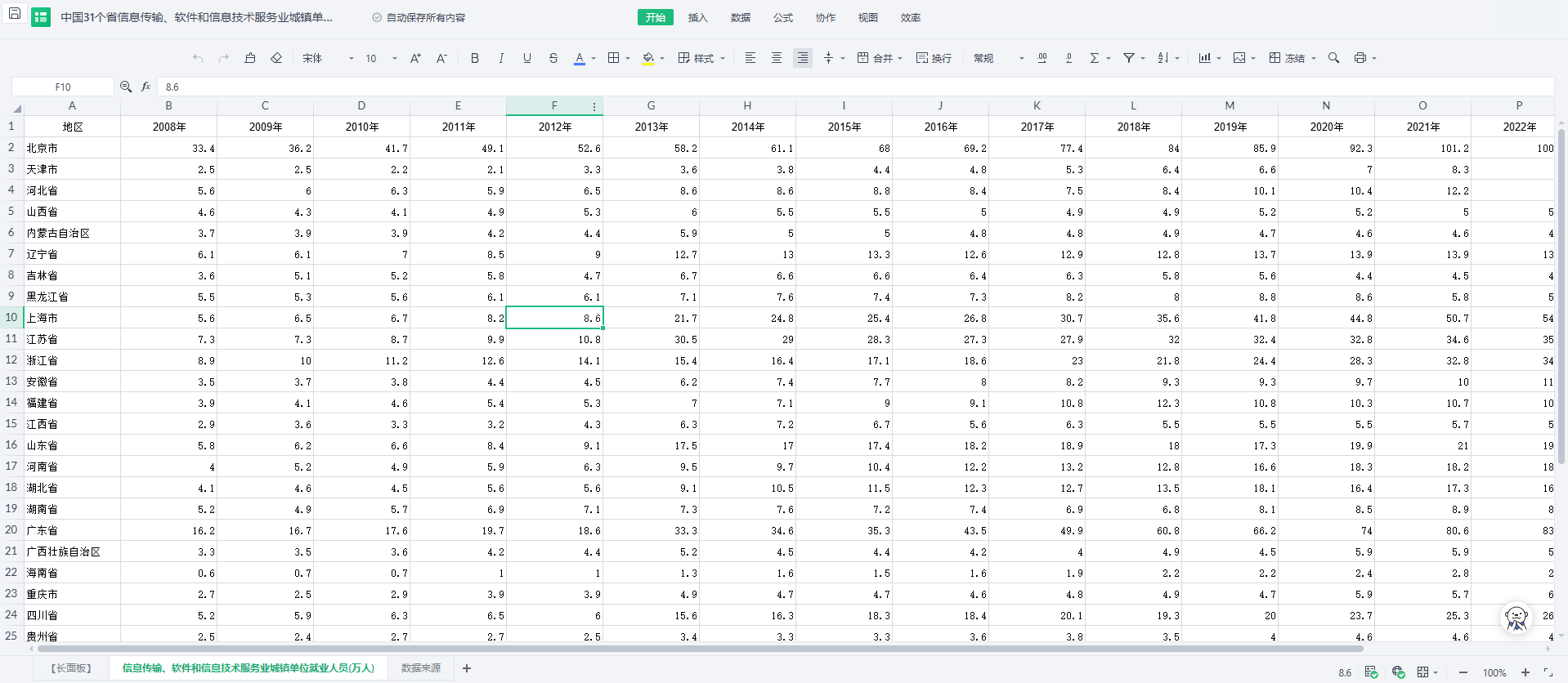 【面板数据】分省信息传输软件和信息技术服务业城镇单位就业人员(万)2008-2023年
