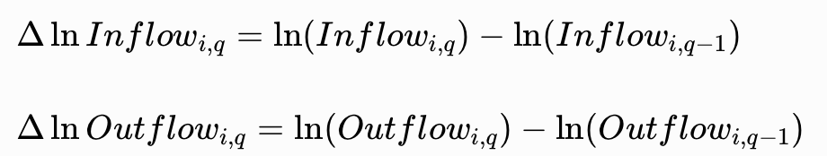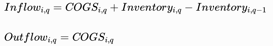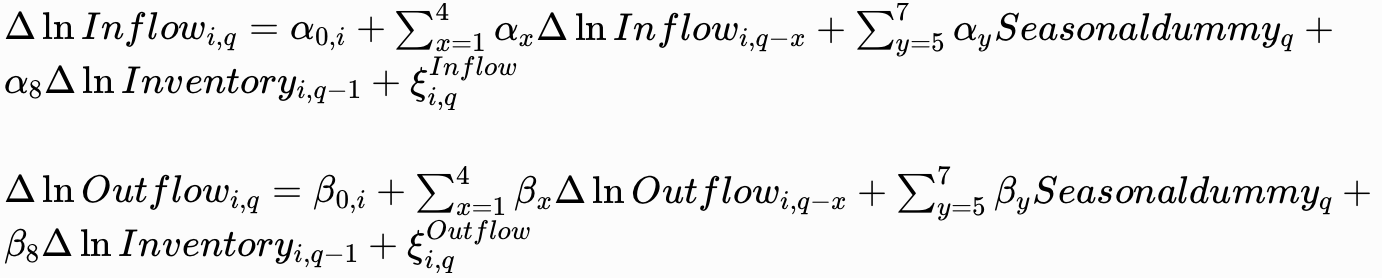 销货成本是指企业在一定时期内生产、购买销售的商品所产生的成本。因此,销货成本可以被认为是利润率调整后的销售。对于制造企业来说,材料流入既包括原材料和零部件的流入,也包括企业自己将投入转化为制成品的制造过程。对于材料流出,由于牛鞭比率测量是基于库存和库存是基于成本计算的,遵循先前的文献使用COGS系列来代表材料流出。为了消除附加值的影响(从产品成本到销售额的价值增加可能会干扰牛鞭测量),物料流出量是根据销货成本而不是销售额来计算的。 作者关注的是牛鞭比率是否放大了需求不确定性,它捕捉到了需求可变性的不可预测成分。在Bray和Mendelson(2012)的基础上,采用了预测进化需求过程⁺的模型,并区分流入和流出序列的可变性和不确定性来衡量企业的牛鞭效应。估计过程遵循三个步骤: 第1步,对流入和流出序列进行对数变换和一阶差分变换,去除时间趋势: 第2步,估算流入和流出的预测。流入和流出预测模型遵循自回归过程,定义如下: 解释变量是前四个季度的物质流入/流出、滞后的ΔlnInventory和季节指标(BrayandMendelson,2012)。由于季节性可以被管理者预测,它不构成不确定性。通过包括q-1到q-4的变量和季度虚拟变量,解决流入和流出序列的季节性问题。 第3步,计算企业的牛鞭比率,用BWR⁺表示为物料流入预测误差的标准差与物料流出预测误差的标准差之比: 在主要分析中,计算了公司在所有时期的流入和流出的预测误差的标准差。因此,BWR指标是一个时不变变量。BWR大于1表明存在牛鞭效应(即生产或采购的波动大于需求的波动),BWR小于1表明不存在牛鞭效应。