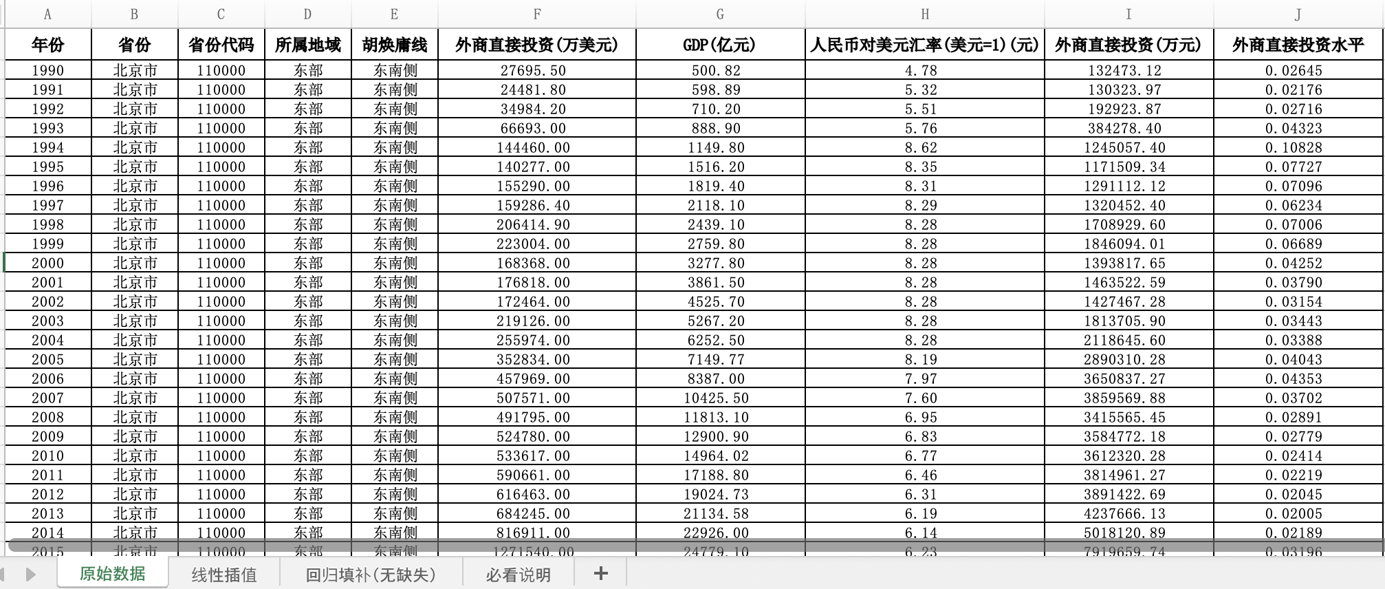 全国各省外商直接投资水平数据(1990-2024年)外商直接投资美元人民币(含插值回归填补版)
