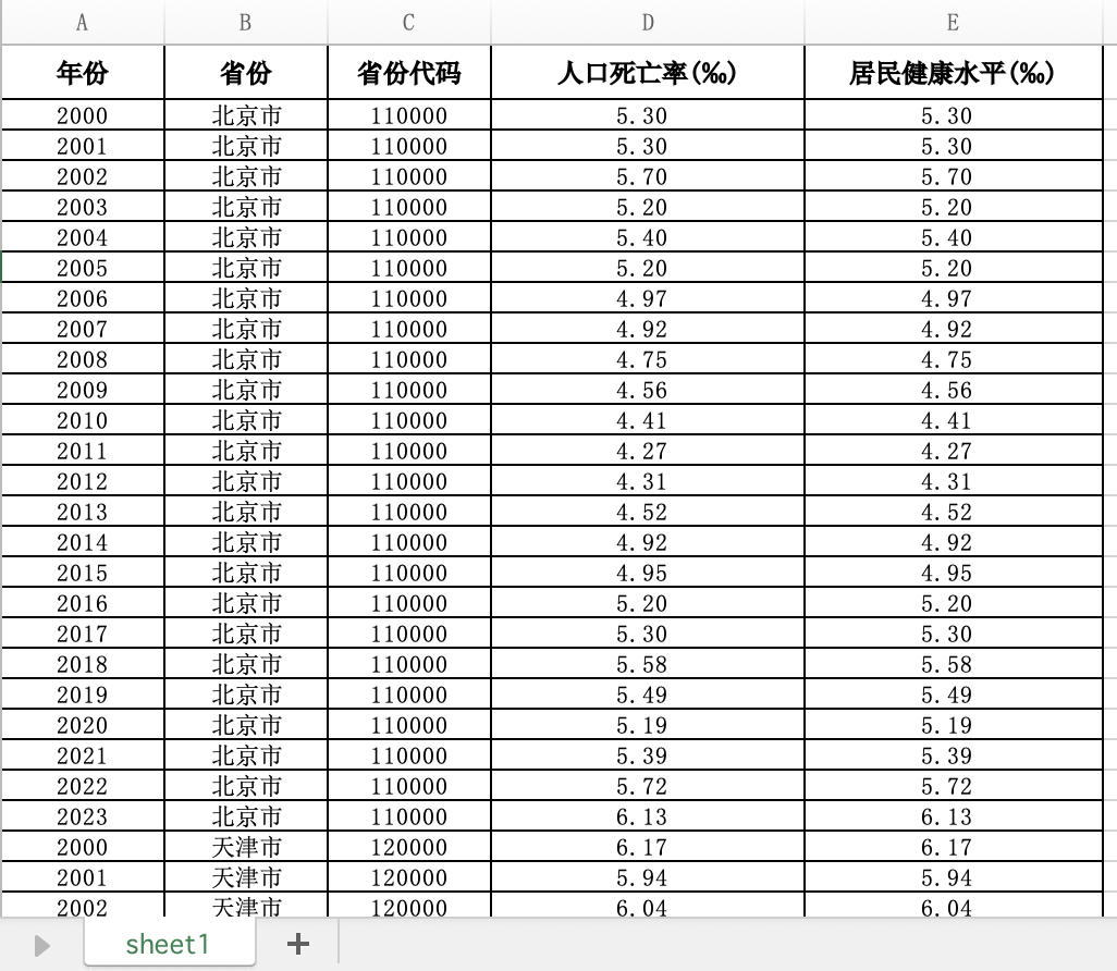 全国各省居民健康水平数据(2000-2023年)基于人口死亡率的长期面板数据