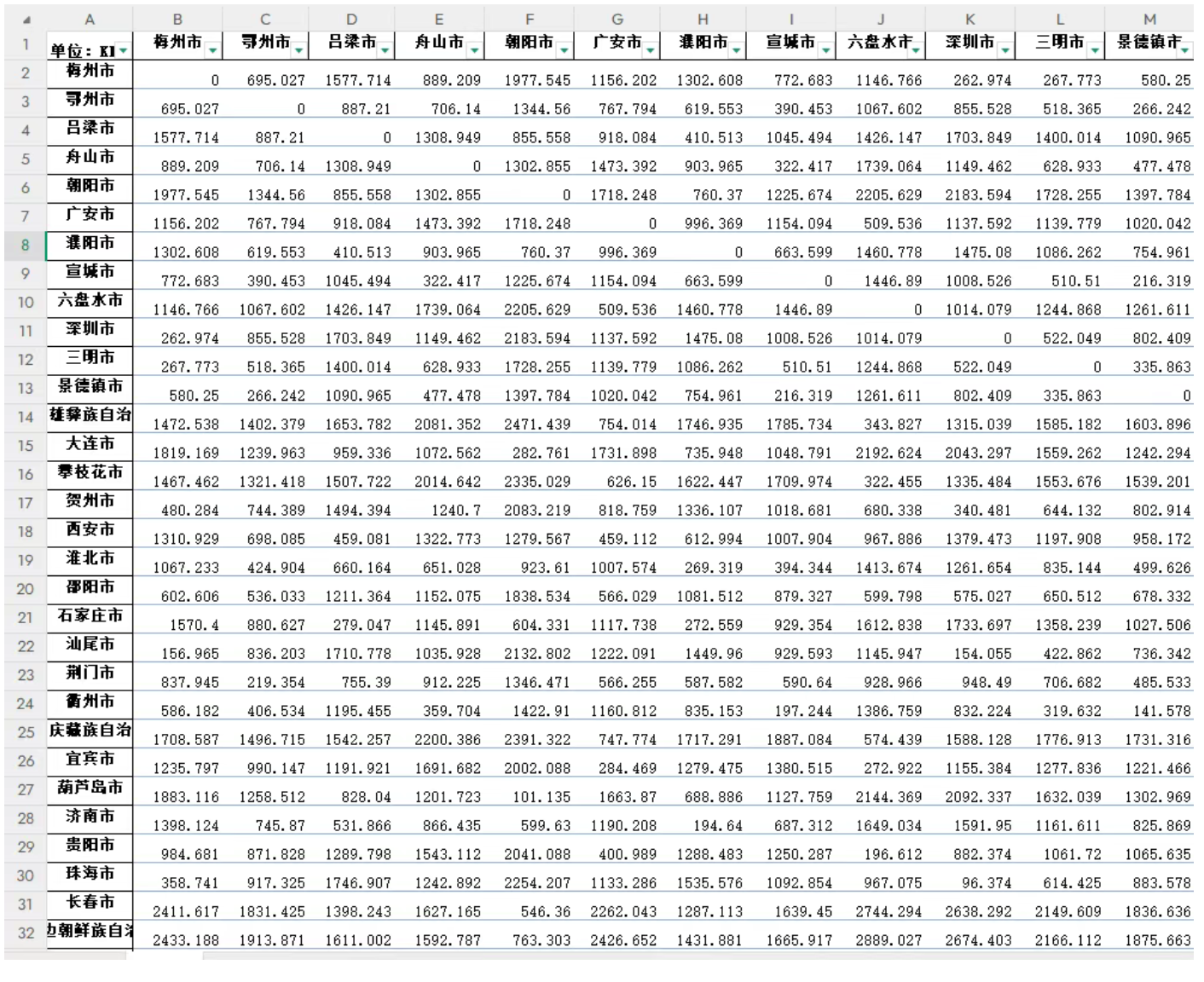 中国城市间地理距离矩阵数据集,通过审图号GS(2024)0650的中国城市地图在Albers投影坐标系中进行计算得出矩阵表格,单位为KM,方便大家研究使用。中国城市地理距离矩阵数据通过计算城市中心距离构建地理矩阵,可用于工具变量设计(如到杭州的距离)、物流成本评估及环境治理分析,为学术与政策提供量化依据。