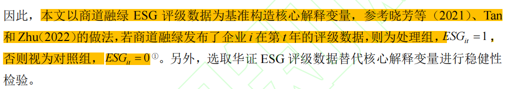 借鉴《数量经济技术经济研究》中胡洁等(2023)方法,团队以商道融绿ESG评级数据为基准构造核心解释变量,若商道融绿发布了企业在当年的评级数据,则为处理组,ESG=1,否则为0