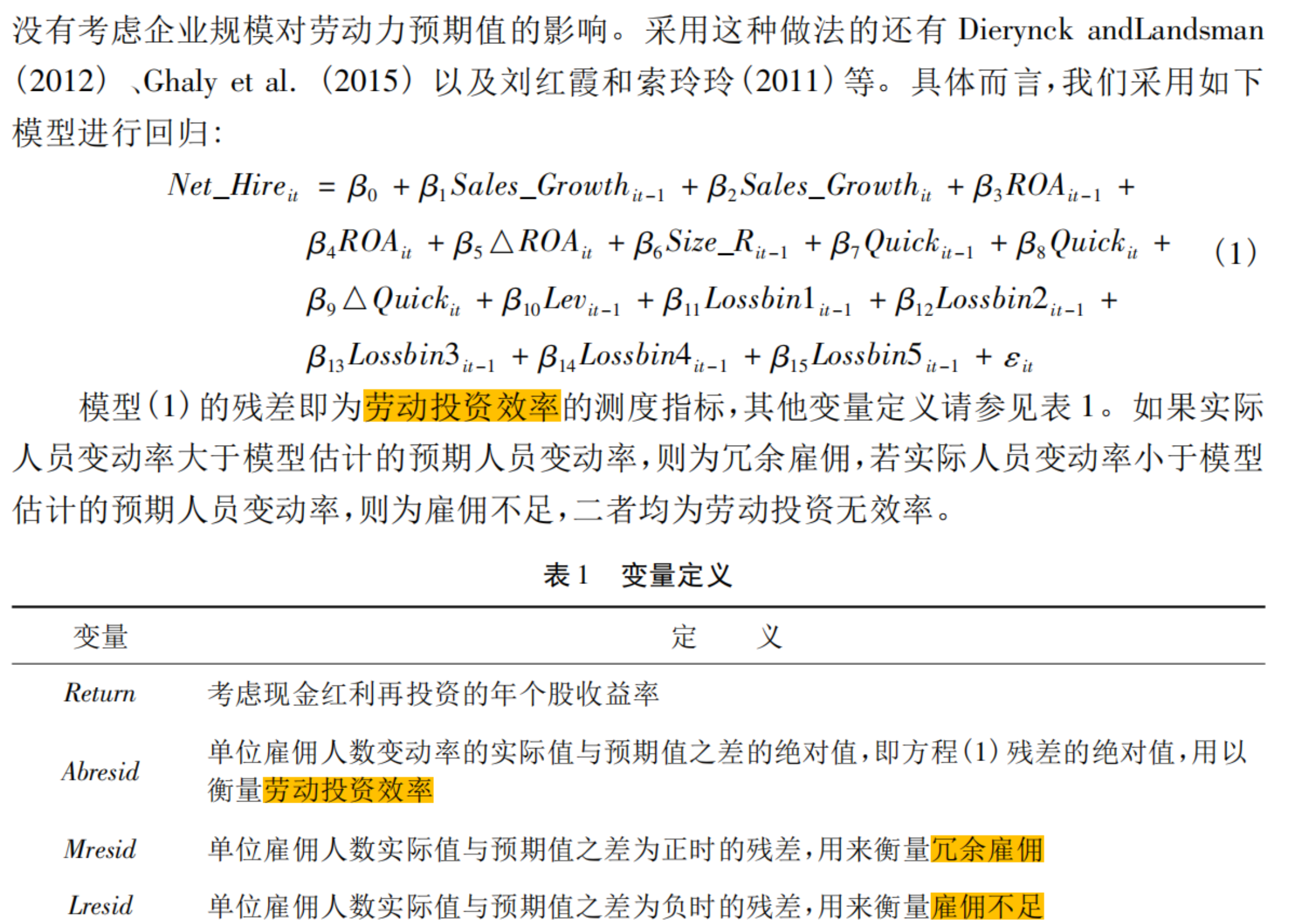 三、计算方式参考孔东明等(2017)的《劳动投资效率、企业性质与资产收益率》一文中的方法对劳动投资效率进行计算