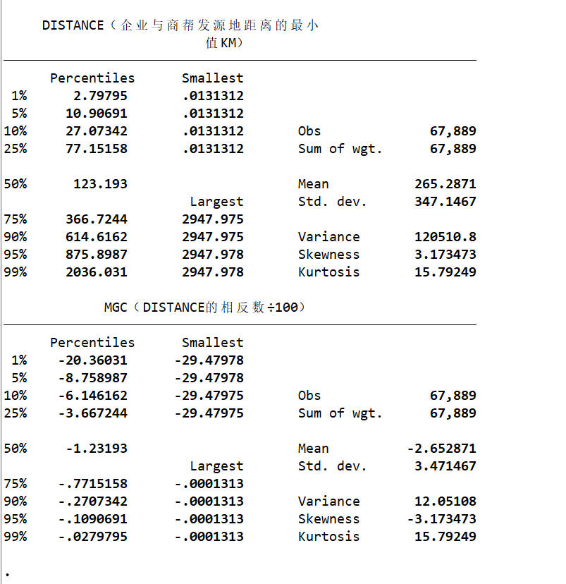 【MGC(DISTANCE 的相反数/100)】根据参考文献中的描述性统计估计出 MGC 应当为DISTANCE的相反数/100,从而MGC值越大表示企业受商帮文化影响越深