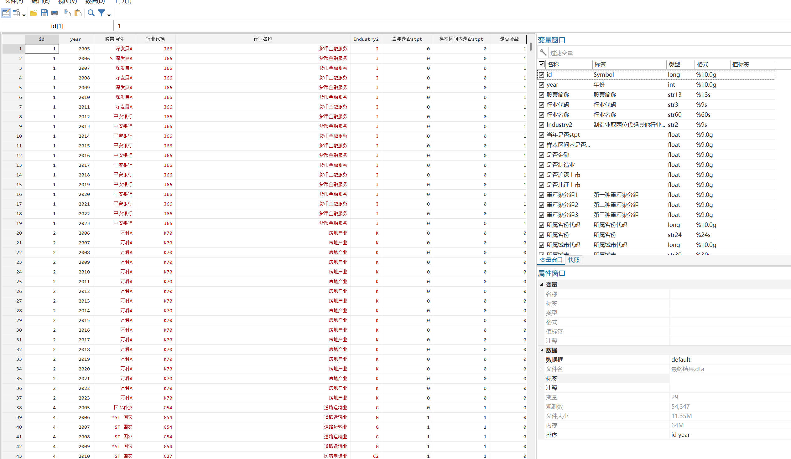 id 年份 股票简称 行业代码 行业名称 Industry2 当年是否stpt 样本区间内是否stpt 是否金融 是否制造业 是否沪深上市 是否北证上市 重污染分组1 重污染分组2 重污染分组3 所属省份代码 所属省份 所属城市代码 所属城市 是否属于西部 是否属于东部 是否属于中部 产权性质 是否资不抵债 管理层平均薪酬 员工平均薪酬 内部薪酬差距 管理层劳动收入份额 员工劳动收入份额