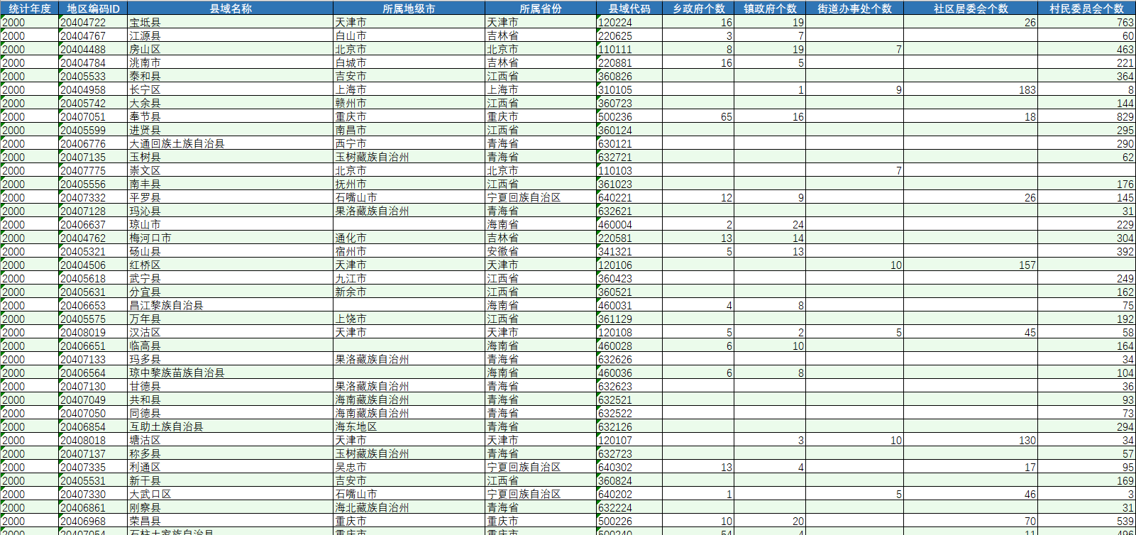 | 县域代码 | 乡政府个数 | 镇政府个数 | 街道办事处个数 | 社区居委会个数 |