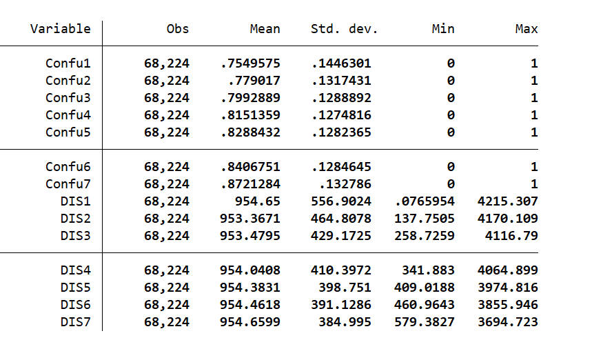 本文借鉴C刊《管理学刊》潘子成(2022)老师的研究,使用公司注册地与儒家文化中心的地理距离来衡量儒家文化(Confu)对企业的影响程度。 儒家文化经过几千年的发展,逐渐形成了鲁、洛、蜀、闽、泰州、临川、浙东 7 个儒家文化中心,分别坐落于山东曲阜、河南洛阳、四川成都、福建三明、江苏东台、江西抚州以及浙江省东部(比如,宁波、绍兴等)。 在此基础上,通过以下步骤测量儒家文化影响力大小:首先,使用谷歌地图、百度地图等互联网工具收集公司注册地以及儒家中心的经纬度。 其次,计算注册地到7 个儒家中心的地理距离,并求均值 DIS。 最后,计算儒家文化影响力强度,公式为:Confu=(Max_DIS-DIS)/(Max_DIS-Min_DIS),其中 Max_DIS、Min_DIS 为同年所有上市公司到 7 个儒家中心平均地理距离的最大距离和最小距离。 Confu 值越大表示企业所受到儒家文化影响程度越高。