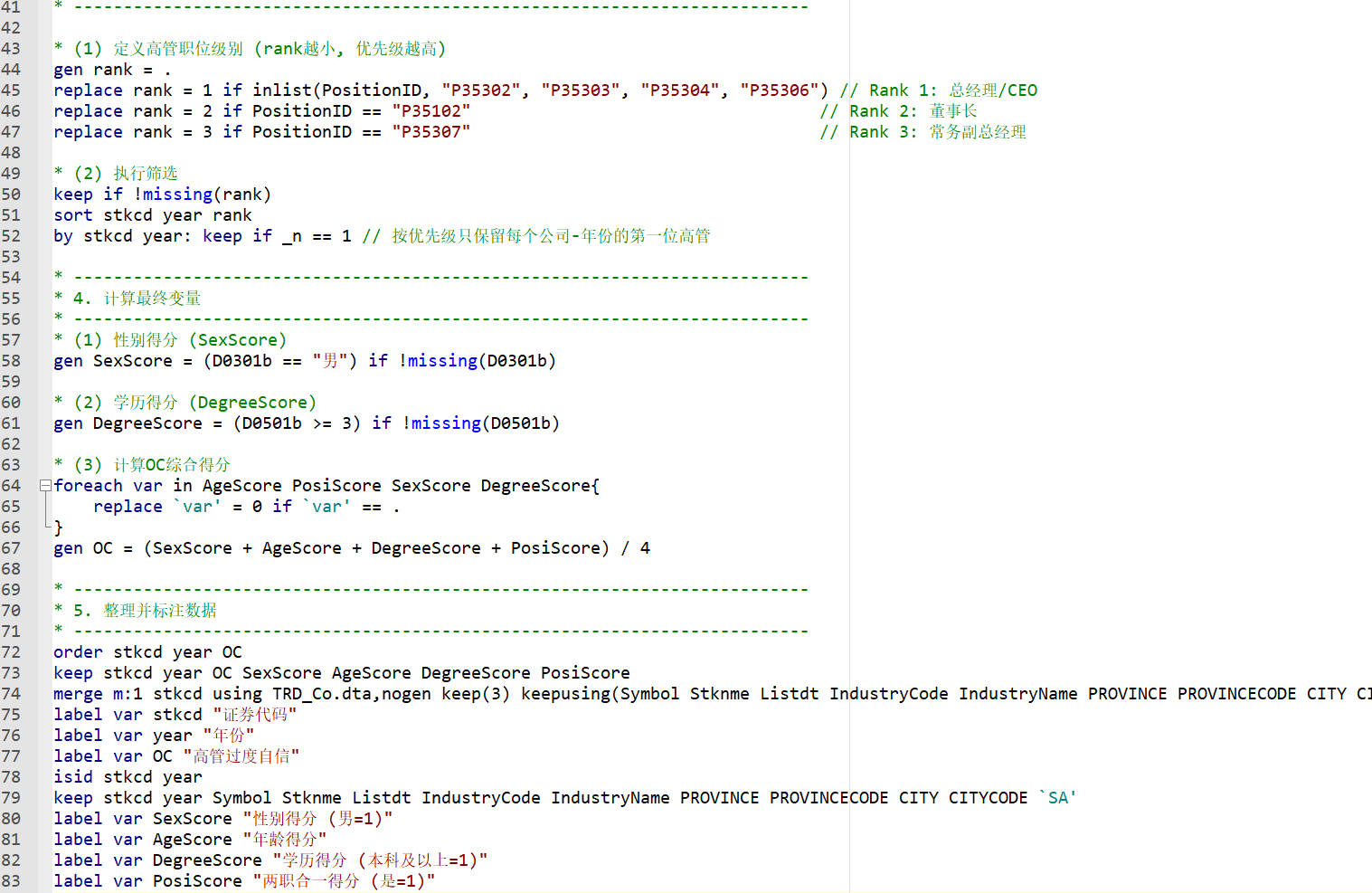 参考《工业技术经济》魏哲海老师的做法,采用打分法,我们关注的管理者个人特征包括: 性别、年龄、学历以及两职合一情况。本文采用打分方法来构建管理者过度自信指标,具体打分过程如下不同个人特征反映的信息可能不够全面,因此直接利用单一特征得分来度量管理者过度自信的程度可能存在一定的局限性。因此,基于 (1)~ (4) 中的分析,本文以上述4种个人特征分数的算术平均数作为综合得分,并以此来度量管理者过度自信的程度。综合得分越高,管理者过度自信程度越高。