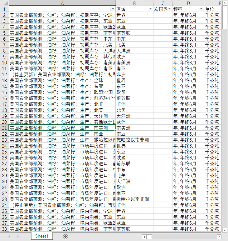 美国农业部预测:油籽:油菜籽:收获面积:北非