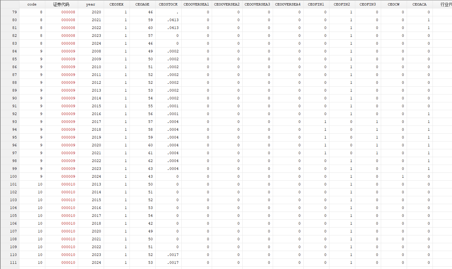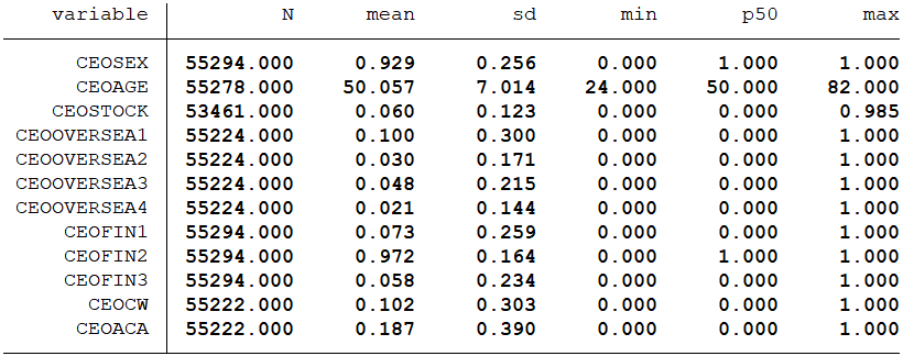 CEOSEX:CEO性别,性别为男性取值为1,否则为0