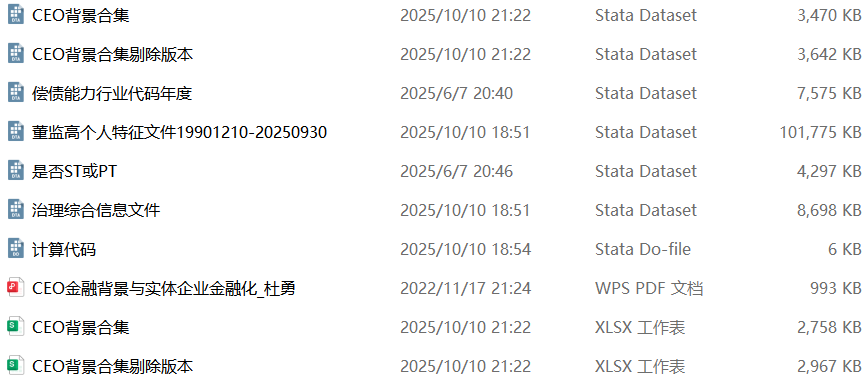 版本2:在做了上述剔除处理的基础之上,同时剔除了金融行业的样本和当年年末被ST、*ST或PT的上市公司,文件名为“CEO背景合集剔除版本”
