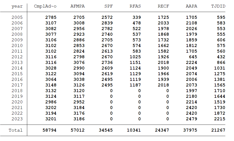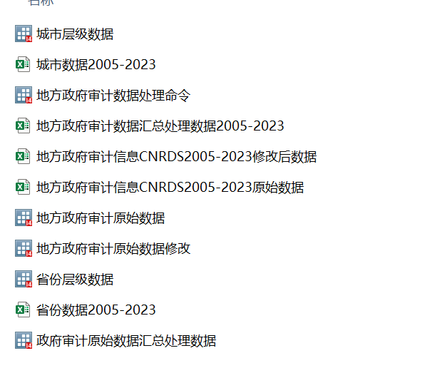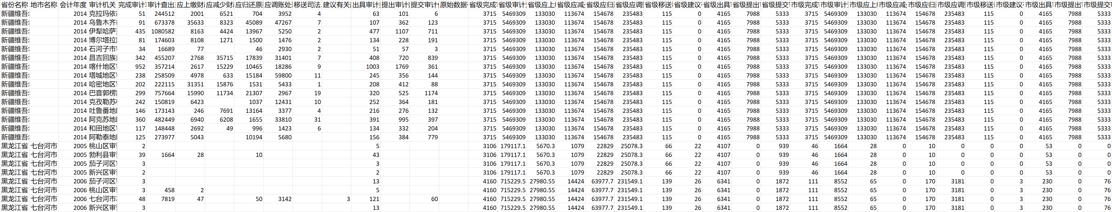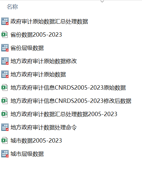 数据名称:地方政府审计数据;数据时间跨度:2005-2023年;数据内容:县区审计数据(原始数据)、地市级审计数据(经stata加总)、省级审计数据(经stata加总);数据字段:省份名称 地市名称 会计年度 审计机关 完成审计项目 审计查出主要问题金额 应上缴财政 应减少财政拨款或补贴 应归还原渠道资金 应调账处理金额 移送司法、纪检监察部门处理 建议有关部门处理 出具审计报告数量 提出审计建议 提交审计信息 原始数据有问题备注 省级完成审计项目 省级审计查出主要问题金额 省级应上缴财政 省级应减少财政拨款或补贴 省级应归还原渠道资金 省级应调账处理金额 省级移送司法、纪检监察部门处理 省级建议有关部门处理 省级出具审计报告数量 省级提出审计建议 省级提交审计信息 市级完成审计项目 市级审计查出主要问题金额 市级应上缴财政 市级应减少财政拨款或补贴 市级应归还原渠道资金 市级应调账处理金额 市级移送司法、纪检监察部门处理 市级建议有关部门处理 市级出具审计报告数量 市级提出审计建议 市级提交审计信息,如图1所示;包括原始数据,修改后原始数据(原始数据中存在数值型数据中存在文本型字符串的情况,并备注哪些数据存在问题),处理的do命令,处理后的stata和excel数据,如图2所示。包括数据层级:区县级数据(即原始数据)、城市数据和省份数据,直接拿来就可以用不同层级的有效值分布如图3-图8所示。
