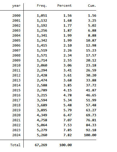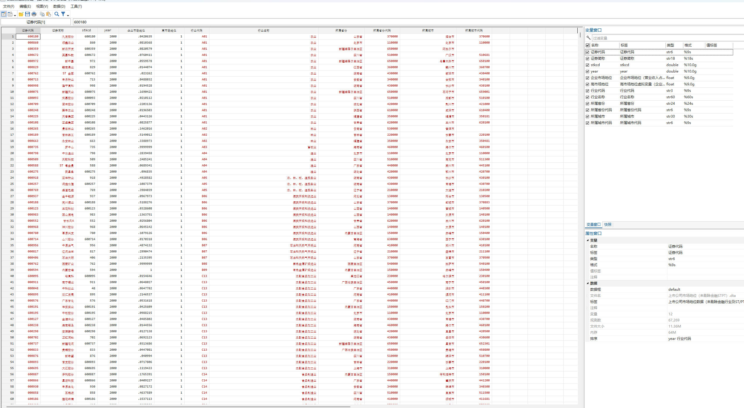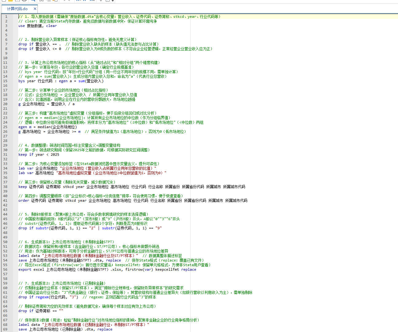 按照参考文献做法计算企业市场地位,首先计算企业所处行业营业收入总值,之后计算企业营业收入占行业营业收入的比值,最后计算样本中该比值的均值,将样本分为高低市场地位两组,值较大一组为高市场地位组赋值为1,值较小的一组赋值为0。其中企业营业收入占行业营业收入的比值即为企业市场地位。上述虚拟01变量即为高市场地位分组变量