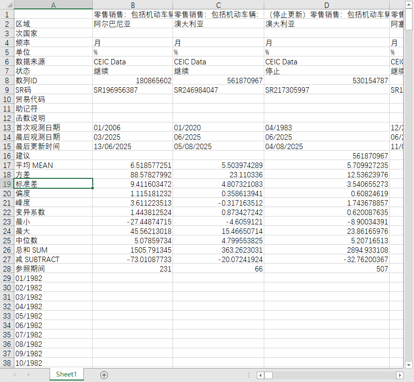 全球世界各国地区零售销售包括、不包括汽车机动车辆同比增长2000-202506月度数据月度季度年度数据