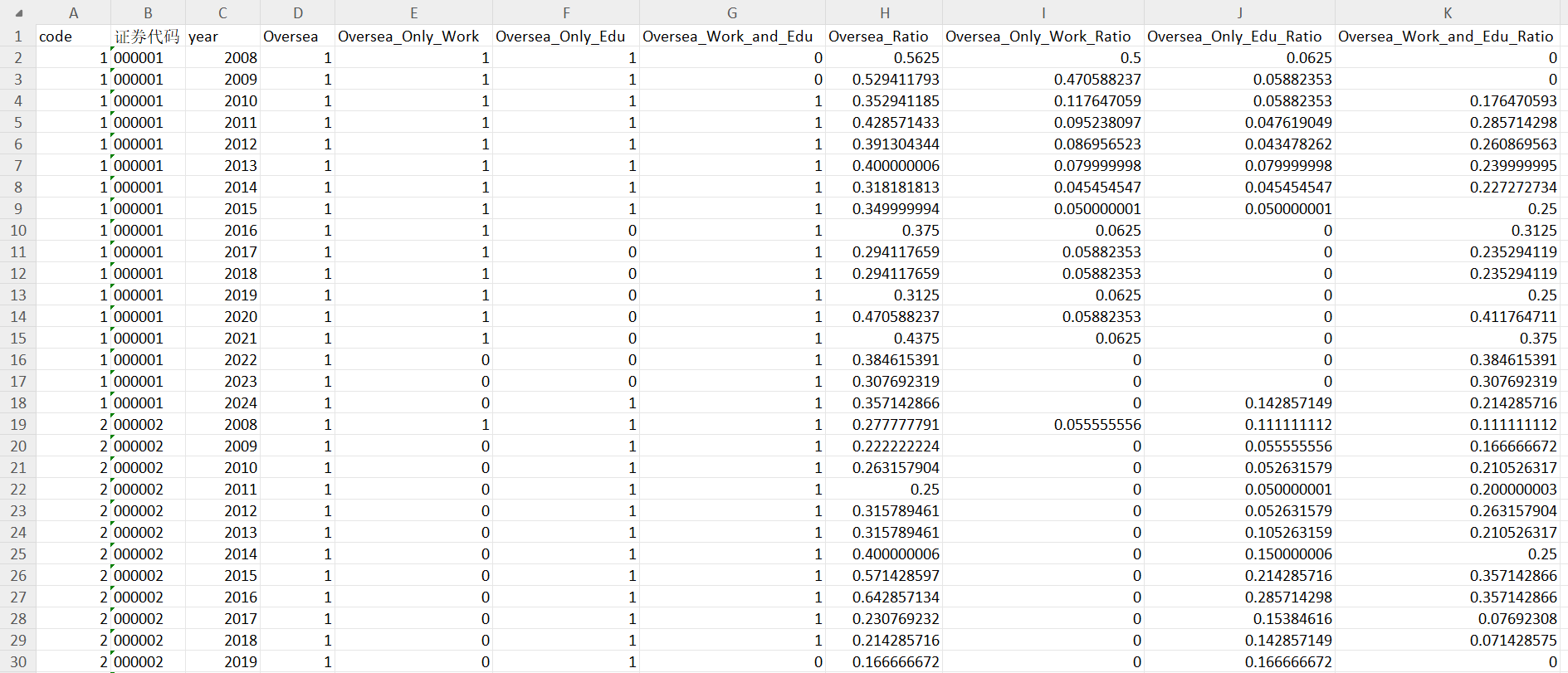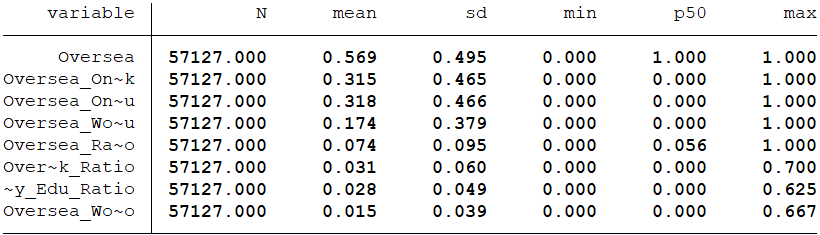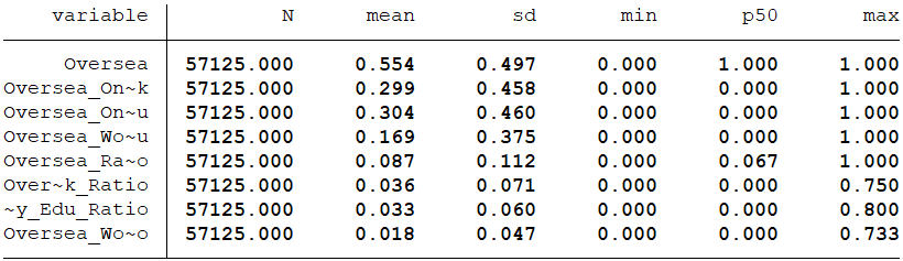 海外学习及工作经历高管占比Oversea Work and Edu Ratio:同时具有海外学习和工作经历的高管人数除以高管人数 注:后四个变量中的高管指的是高管和董事