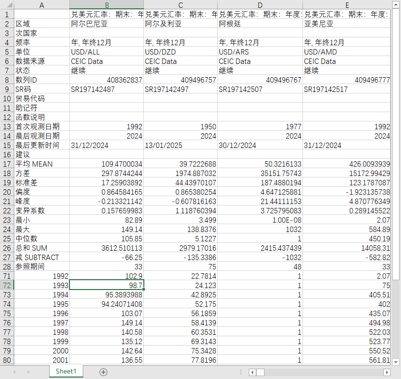 全球世界各国地区兑美元汇率期末、期内平均2000-202506月度年度数据