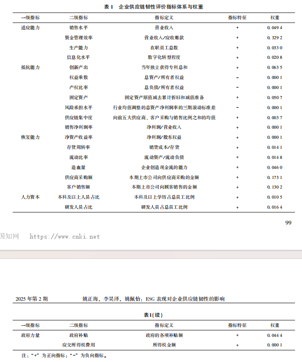 参考《ESG 表现对企业供应链韧性的影响,姚正海, 李昊泽, 姚佩怡》,搜集了2005-2024这20年的上市公司企业数据,按照表1构建指标体系,采用熵权法进行测算
