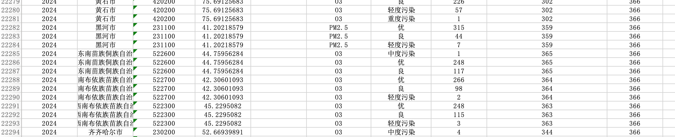 空气质量数据。是通过各种监测手段收集的反映大气环境中污染物浓度和成分的信息。包括API(2001-2013)、AQI(2014-2024)、首要污染物等数据。能够帮助研究人员评估空气污染状况及其对经济和环境的影响