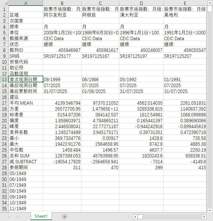 全球世界各国地区金融证券市场股票市场指数2000-202506月度数据