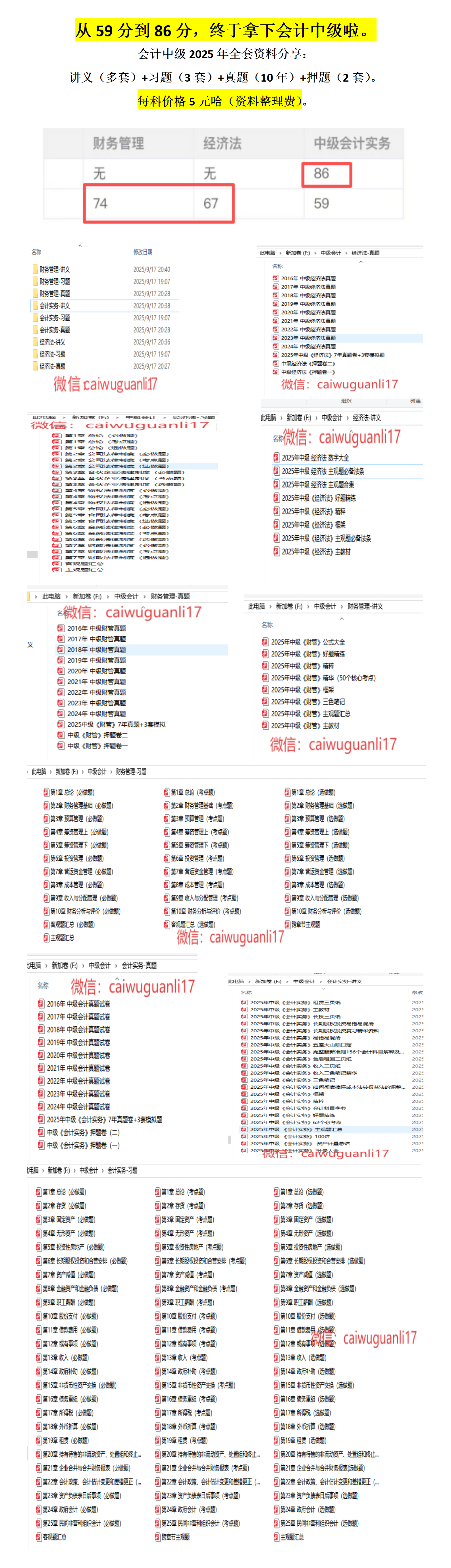 2025年会计中级,最新全套讲义和习题+真题备考资料。刚参加完2025年的中级考试的朋友,大家可以互相交流,有需要资料的也可留言或留邮件。