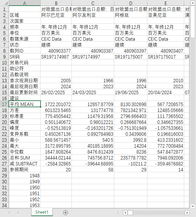全球世界各国地区对外国际贸易对欧盟出口总额美元2000-202506月度季度年度数据