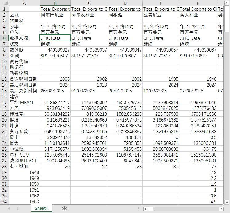 全球世界各国地区对外国际贸易对中国出口总额美元2000-202506月度季度年度数据