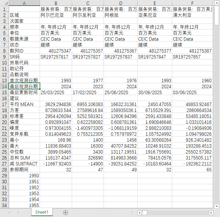 全球世界各国地区国际收支服务贸易、及占名义国内生产总值百分比2000-202506月度季度年度数据