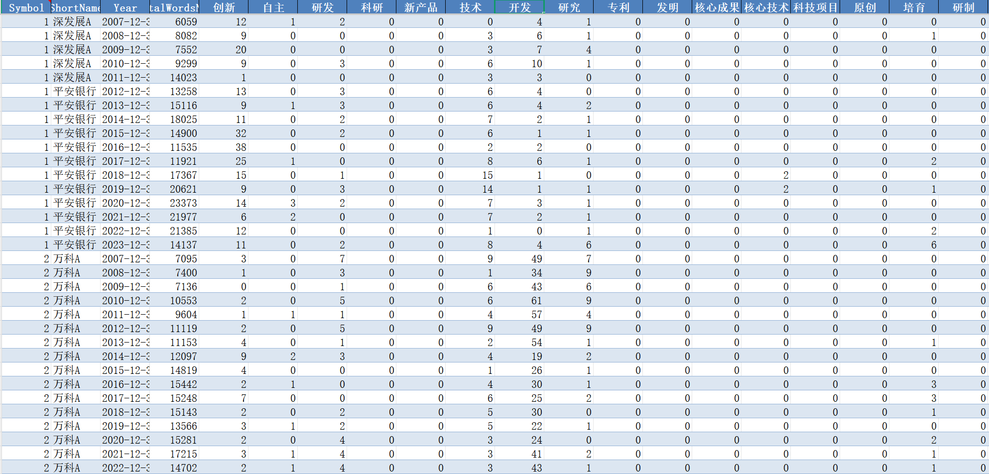 筛选出基础词集和拓展词集后,利用jieba分词库对年报中的MD&A部分进行中文分词,计算词集中词汇总词频占MD&A总词频的比例并乘以100,得到企业家创新注意力配置指标。