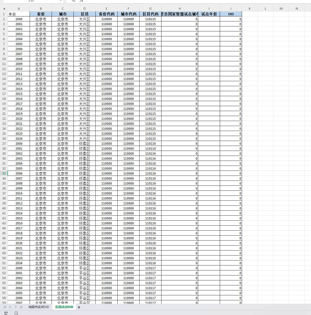 年份 省份 城市 省份代码 城市代码 所属地域 胡焕庸线 是否国家智慧试点城市 试点年份 DID
