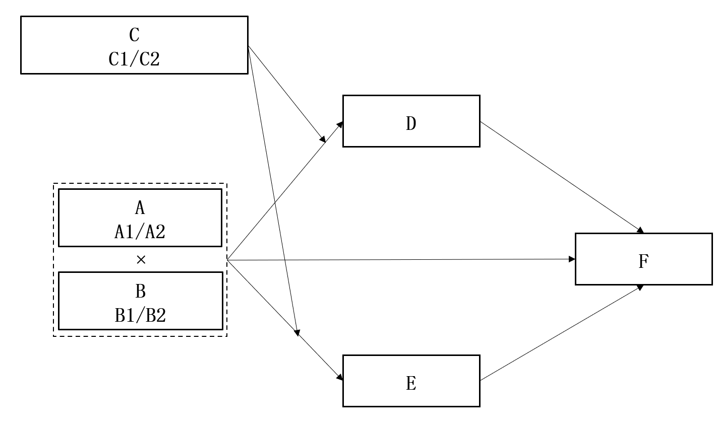 我现在有这样一个理论模型需要检验,自变量是两个二分类变量A、B,中介是D和E,调节是一个二分类变量C,因变量是F,请问下怎么检验中介和调节效应,调节只做对DE的调节。