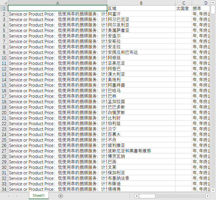 Service or Product Price:低使用率的捆绑服务:计划价格:占一个国家平均每月人均国民总收入的百分比: