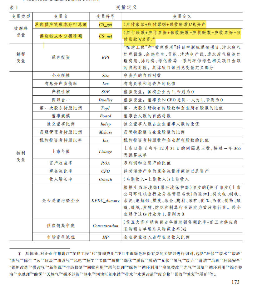 参考C刊《经济管理》刘红霞老师(2024)的做法,从绿色投资企业与供应链其他成员企业关系层面出发,使用两个指标测度供应链成本分担: