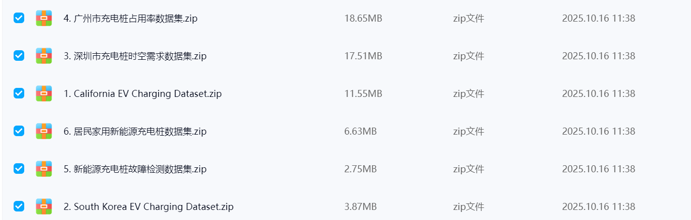 1. 学术研究适配:加州10年数据集、挪威2年家用数据集适合长期趋势分析;深圳时空需求数据集、广州占用率数据集适合“中国一线城市充电桩布局”主题研究;故障检测数据集可用于机器学习故障诊断模型训练(如XGBoost、CNN)。