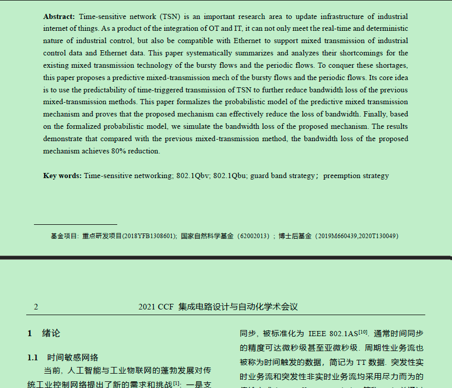 摘要 : 时间敏感网络是工业互联网基础设施转型升级的重要研究方向。作为控制网络和信息网络融合的产物,既能满足工业控制的实时性和确定性,又能兼容以太网 实现工业控制数据和以太网数据的混合传输 本文对现有突发与周期性业务流 的 混合传输技术进行了系统总结并分析了它们的不足 提出了突发与周期性业务流 的 预测式混合传输机制。该机制的核心思想是利用时间敏感网络中 时间触发传输机制的可预测性 去进一步降低混合传输的带宽损失。本文构建了预测式混合传输机制的概率模型,并证明了该机制的带宽 损失优于原混合传输机制。最后,基于概率模型,本文仿真验证了预测式混合传输机制的期望带宽损失,相比于原混合传输机制,下降了 80%.