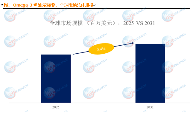 根据QYResearch调研数据显示,市场呈稳步增长态势。预计 2031 年全球Omega-3 鱼油浓缩物市场规模将达 20.2 亿美元,2025-2031 年期间年复合增长率(CAGR)为 3.4%。这一增长与全球健康需求升级密切相关,据世界卫生组织(WHO)2024 年数据,全球超 1/3 成年人存在 Omega-3 摄入不足问题,为补充剂市场提供了广阔空间。