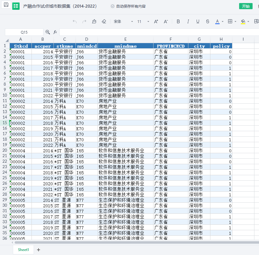 Stkcd | accper | stknme | nnindcd | nnindnme | PROVINCECD | city | policy |