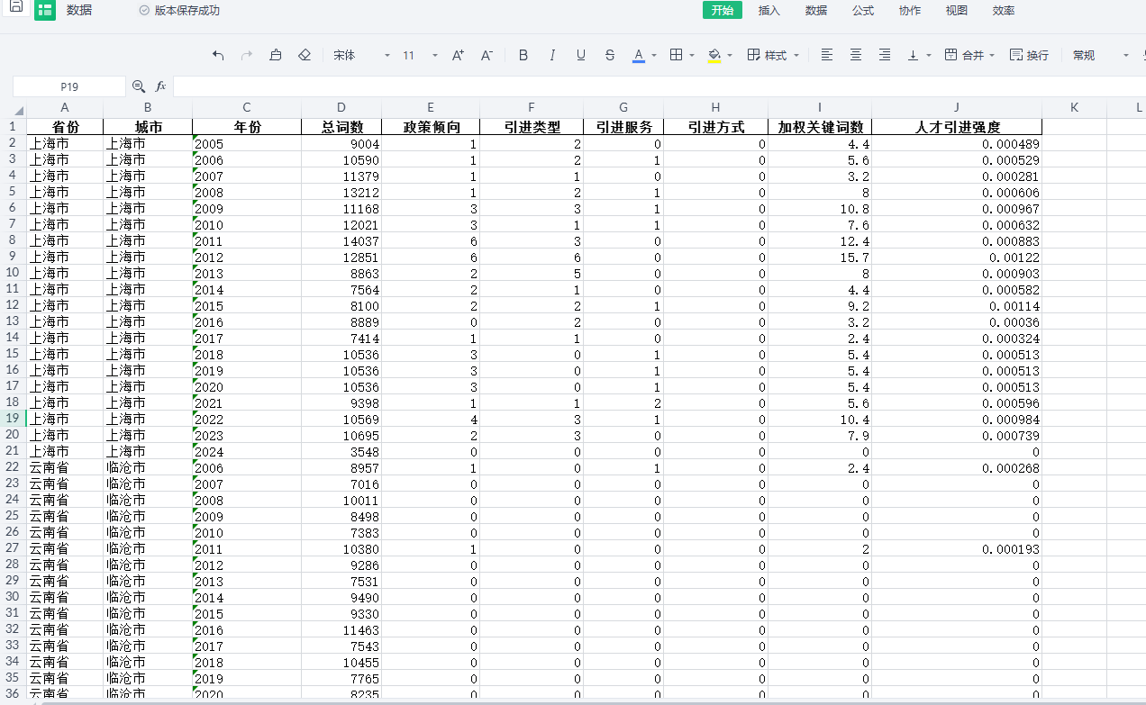 包含指标:省份 城市 年份 总词数 政策倾向 引进类型 引进服务 引进方式 加权关键词数 人才引进强度
