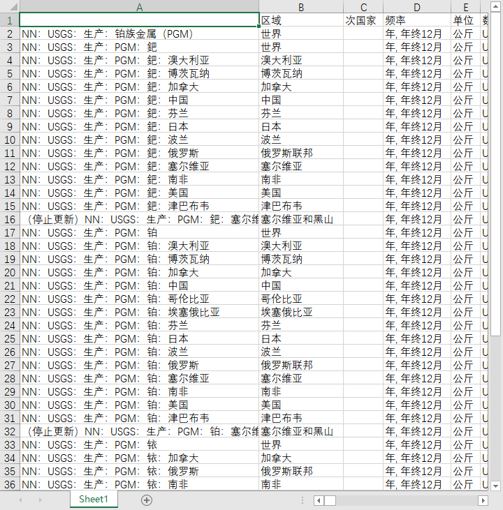 (停止更新)NN:USGS:生产:PGM:铂:塞尔维亚和黑山