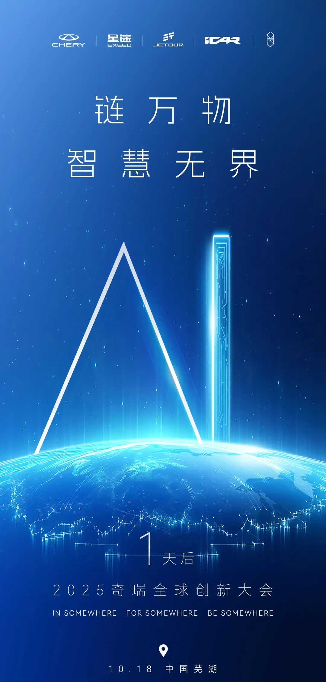 [color=rgba(0, 0, 0, 0.9)]10月18日-21日,以“创新 · 智领全球”为主题的2025奇瑞全球创新大会将在芜湖盛大召开,全方位展示奇瑞在电动化、网联化、智能化、共享化等前瞻领域的最新成果。