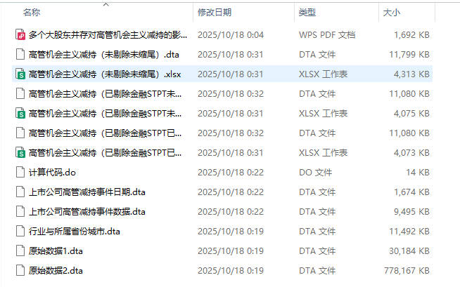 - 三个版本:高管机会主义减持(未剔除未缩尾)、高管机会主义减持(已剔除金融STPT未缩尾)、高管机会主义减持(已剔除金融STPT已缩尾)