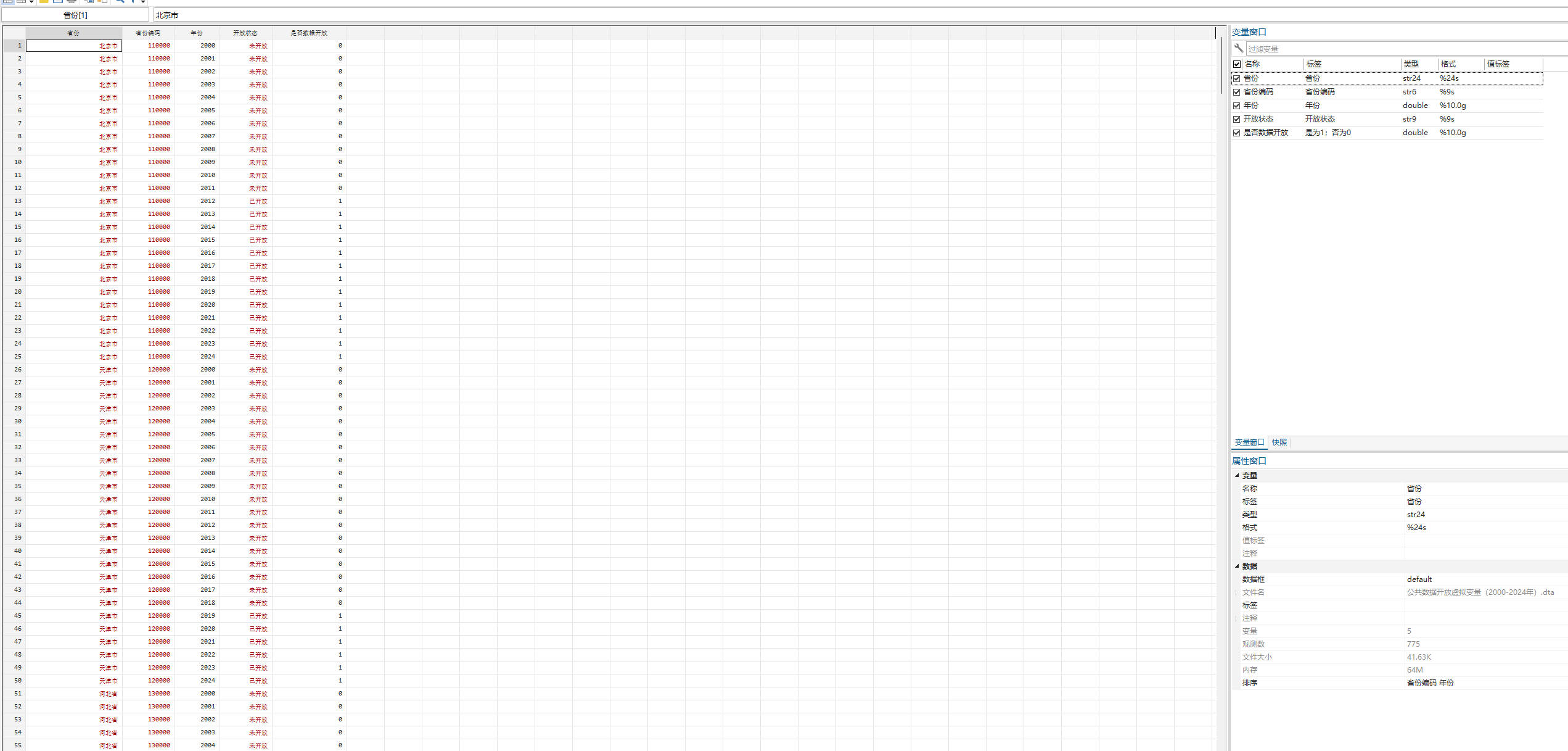 【是否数据开放】省份开放当年及之后年份,是否数据开放赋值为1,其余年份赋值为0。从未开放过的省份,是否数据开放赋值为0。