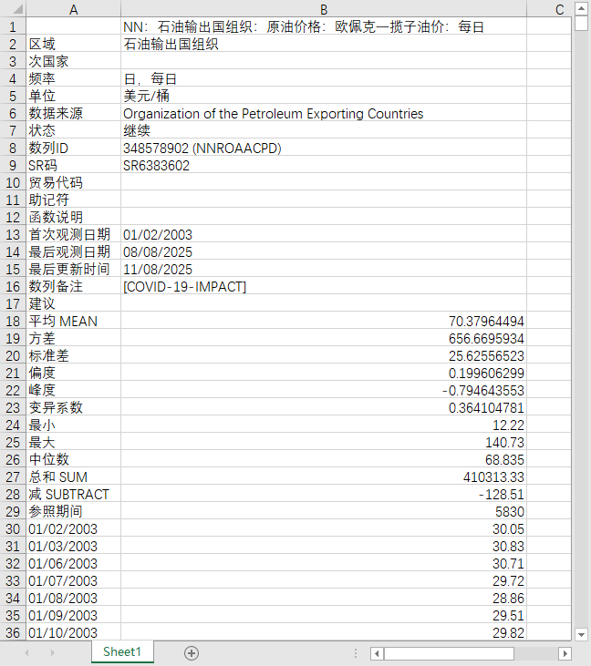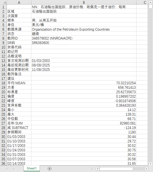 能源行业石油输出国组织原油价格欧佩克一揽子油价每日2003-20250808OPEC原油价格每周